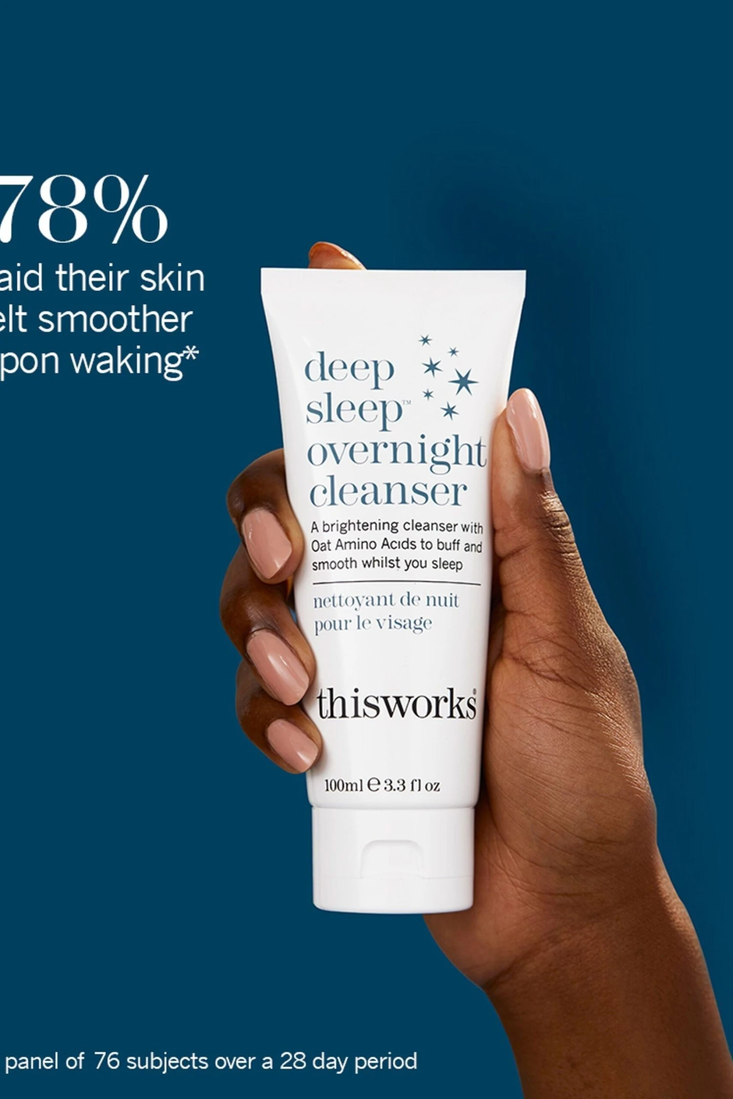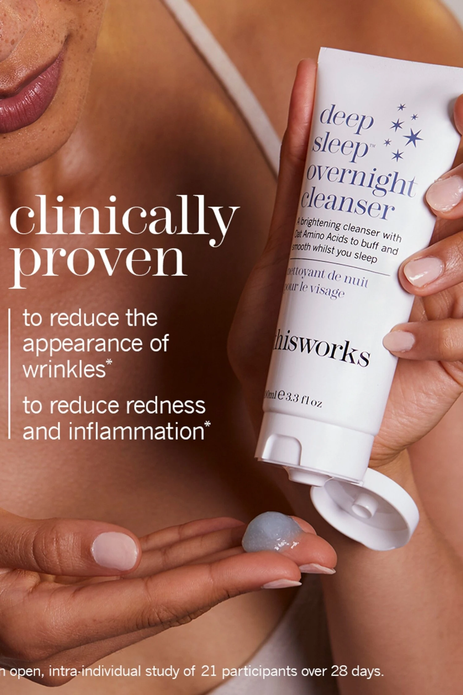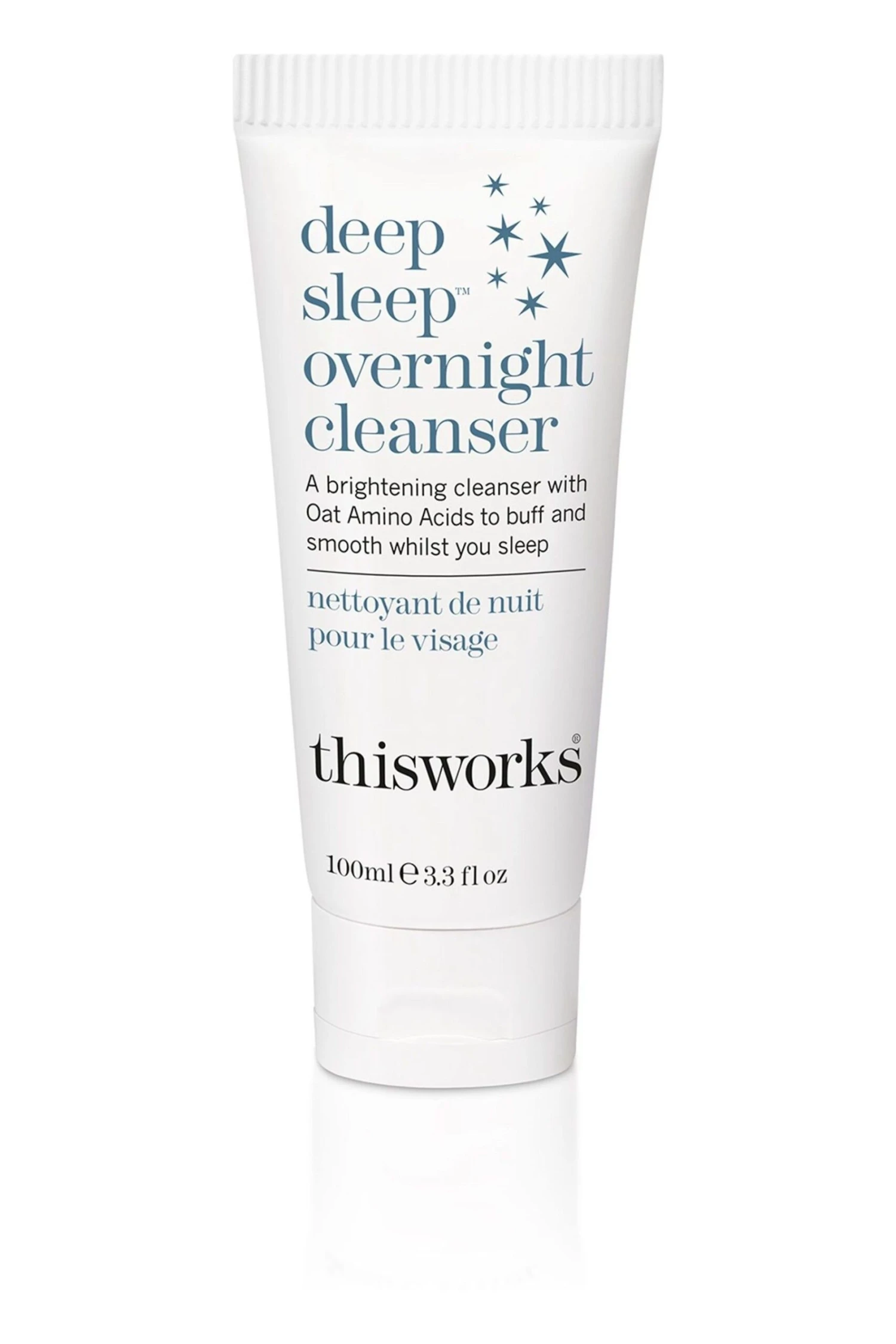 A 99% natural, brightening cleanser with Oat Amino Acids and Hyaluronic Acid to gently exfoliate and hydrate your skin overnight, clinically proven to reduce redness and increase skin hydration. WHEN: Before falling into bed at the end of the day, do one more thing (whilst brushing your teeth) to remove dirt and pollution, for clean and clear skin come morning. A night-time facial that works hard whilst you sleep, suitable for oily, acne prone, dry or combination skin. HOW: A powerful combination of exfoliating Amino Acids, moisturising Hyaluronic Acid and Copper PCA to help balance the skin. A gentle but effective night-time cleanser, infused with the Deep Sleep functional fragrance to help ease the mind. Massage into the skin for 30 seconds before wiping away residue with a cotton pad or muslin cloth. No further rinsing required. Waterproof make-up may require pre-cleansing. Follow with deep sleep overnight cream. WHY: The best step to long-term skin health and vitality. Detox, restore and de-stress overnight and wake up to skin that looks smooth and renewed.