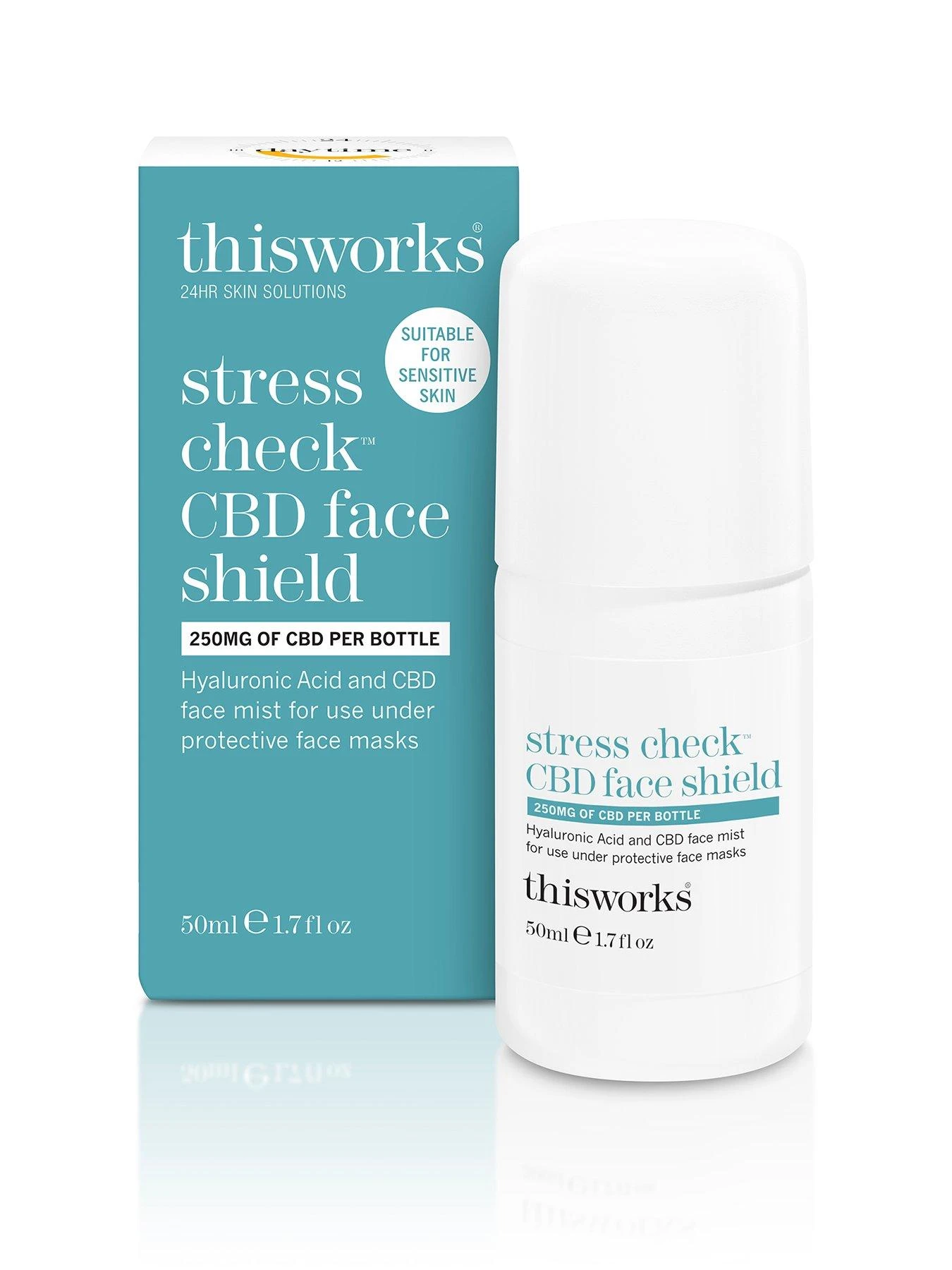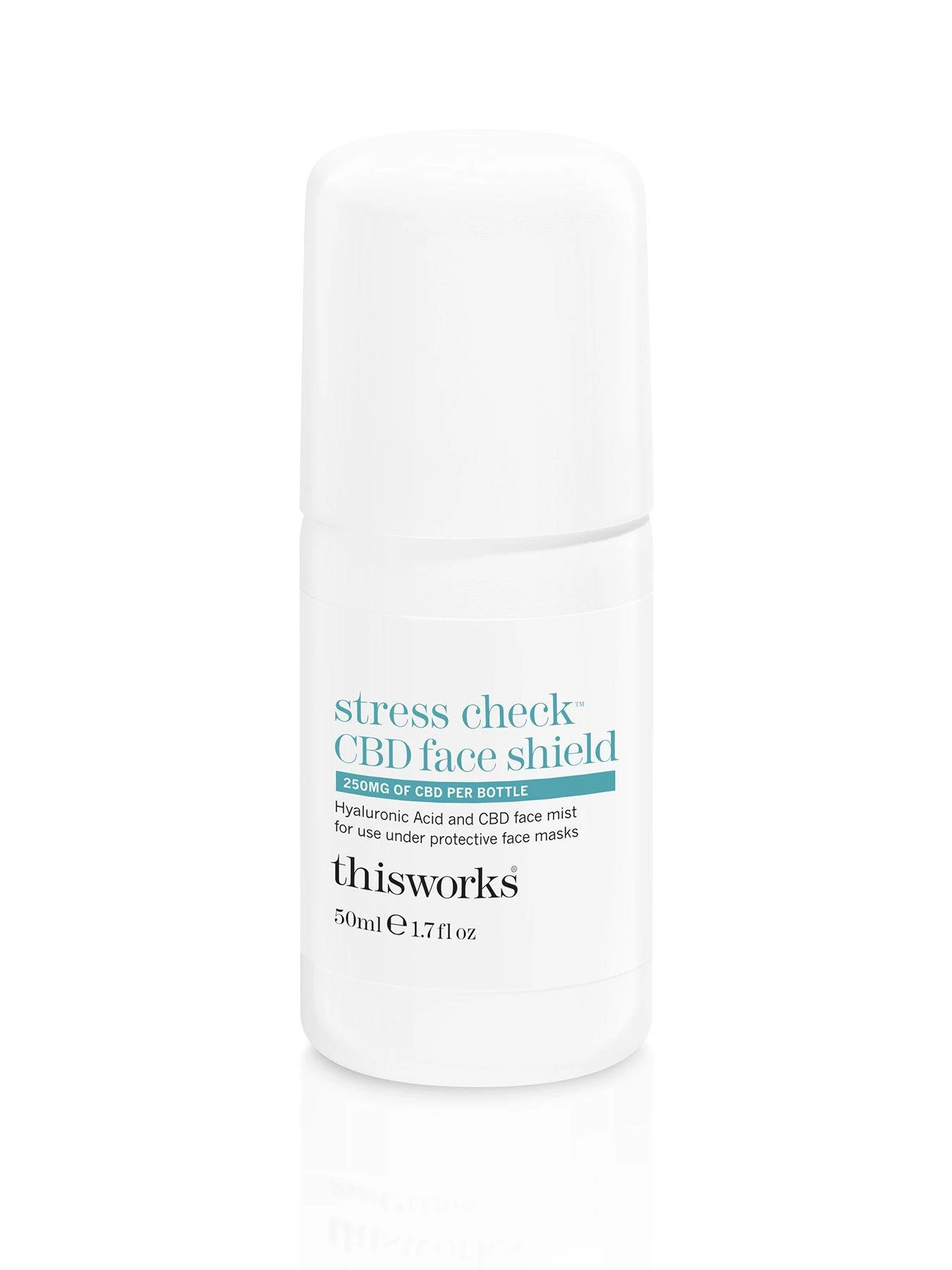 THIS WORKS Stress Check Face Shield is a Hyaluronic Acid and CBD face mist to hydrate skin and alleviate discomfort while wearing a protective face mask.